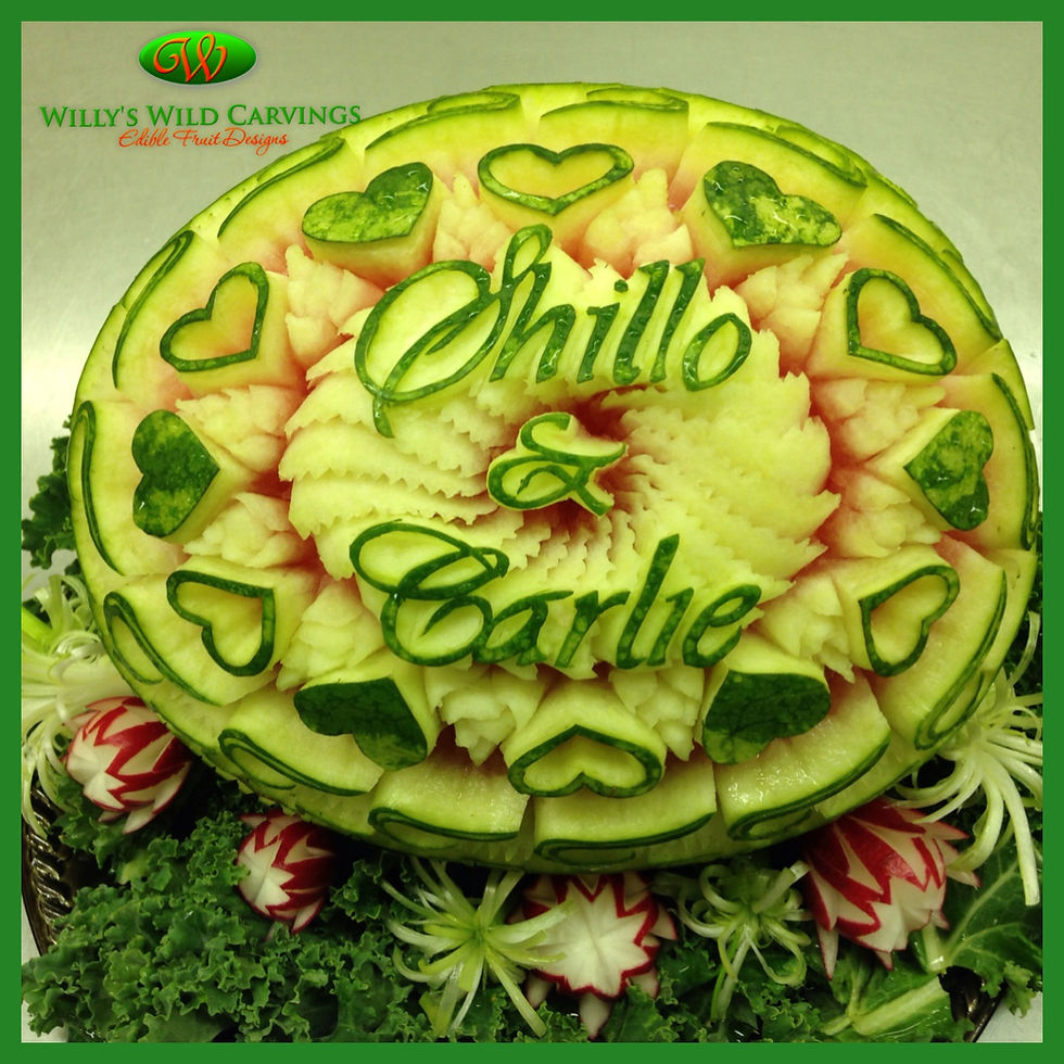 An incredible custom carved watermelon design makes the perfect wedding gift or wedding centerpiece. Surprise them with these unique designs.